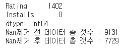 ## Rating, Installs에서 값이 Nan인 데이터를 제거함