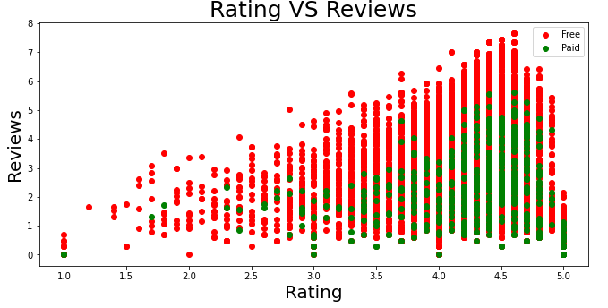 # X축이 Rating, Y축이 Reviews인 점 그래프를 그리기 이 때, Reviews의 값에 log10을 씌우고, Type으로 GroupBy 하여 Type의 값이 'Free'인 경우는 'red', 'Paid'인 경우는 'green' 으로 표시