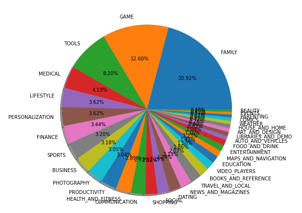 # Category별 구글 플레이 스토어 점유율을 파이 그래프 그리기