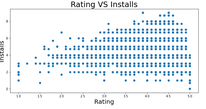 #X축이 Rating, Y축이 Installs인 점 그래프를 그리고 이 때 Installs의 값이 Rating에 비해 지나치게 크기 때문에 log10로 처리함.