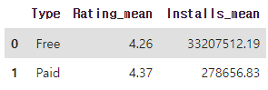 #점유율 상위 5개의 카테고리중 Rating 평균이 가장 높은 Category를 구하고 해당 Category 데이터를 Type별로 GroupBy한 후 Rating, Installs 평균 구하기
