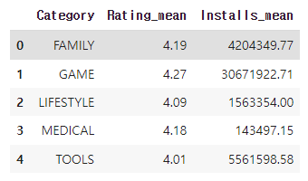 # 점유율 상위 5개의 카테고리를 구하고, 각각의 Rating 평균, Installs 평균 구하기