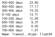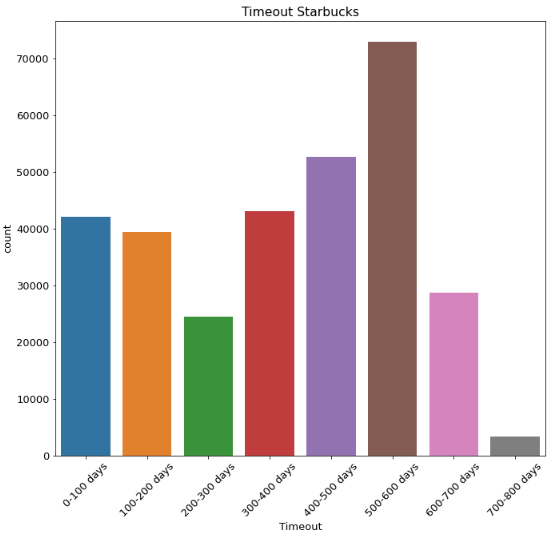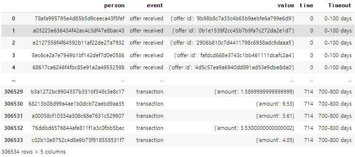 transcript['Timeout'] = pd.cut(x=transcript['time'], bins=[0, 100, 200, 300, 400, 500,600,700,800], include_lowest=True,