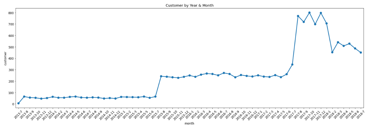 --> 2017년에는 고객이 크게 증가했지만 2018년에는 고객 수가 감소 했다는 것을 알 수 있습니다.