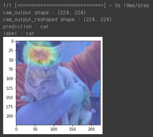 위의 gap_weights가 w1,w2 ... 를 의미한다. shape의 (512,2)를 보면 CNN의 CONV layer의 마지막이 (7, 7, 512)로 feature map이 512개가 생겻는데 이를 각각 GAP(global avg pooling)을 해서 512개가 나오고 강아지 고양이를 구분하는 것으로 label class가 2개이므로 마지막 dense에 연결될 때는 weights가 2개가 필요하게 된다.