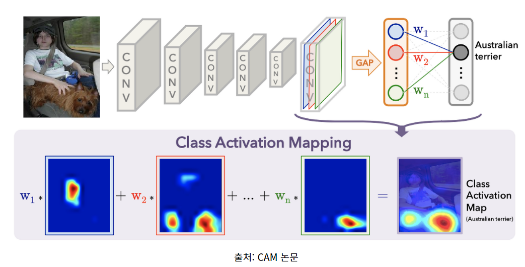 기존에 CNN 활용 시 Feature 추출 후 예측을 위해 Fully connected layer 부분 대신 Global Avg 풀링으로 Convolution layer 부분에서 추출한 feature map과 마지막 예측에 사용된 weight를 곱해서 이미지를 시각화 하는 것이다.