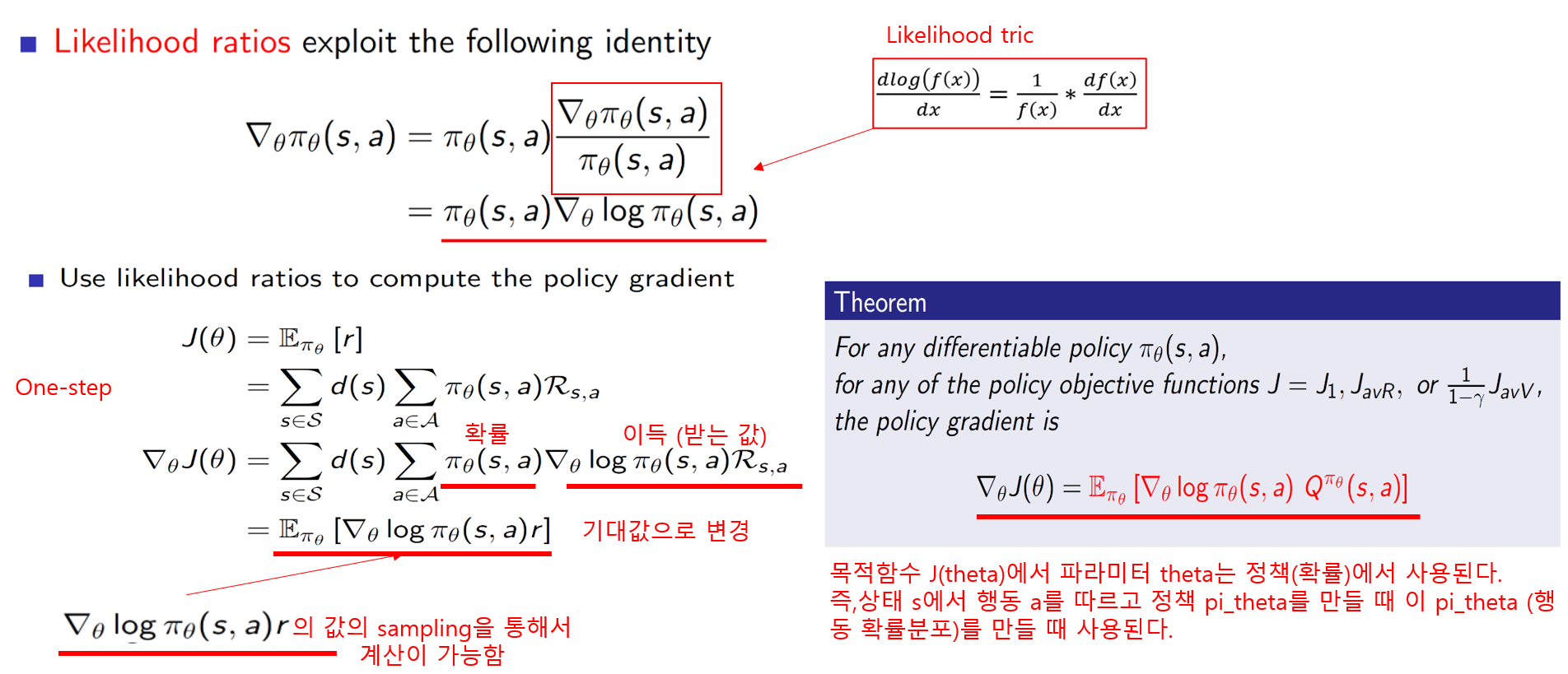 -> Poilicy gradient는 가치함수를 가지고 계산하는 것이 아닌 직접 policy를 학습하며 구하게 된다. 이 때 policy를 평가하기 위해서 그에 맞는 목적함수를 구해서 Policy를 발전시키는 방향으로 진행된다.