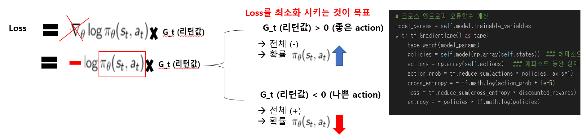 Loss는 ▽J(theta) 가 아닌 J(theta)가 되어야 하므로, 위와 같이 ▽가 지워진 지게 되며, Loss는 항상 최소화 되게 하는 함수이므로 Gradient Ascent 구현을 위하여 (-) 부호를 붙여 준다. 그렇게 되면 리턴값에 따라 확률을 증가시키거나 감소 시키게 학습이 진행된다. 여기서 이 글의 5번에서 설명할 Reinforce 알고리즘에서 Cartpole은 문제는 해결하였으나, Mountain Car 문제는 해결하지 못한 이유를 고민해 보았으며 리턴값이 (-)인 경우에 Loss를 최소화 하게 하려다 보니 확률을 낮춰야 되는데, log 1이 0이 되므로 Loss를 0으로 만들어 버리게 학습하여 잘못학습이 이루어진 것 같다는 생각이 든다.