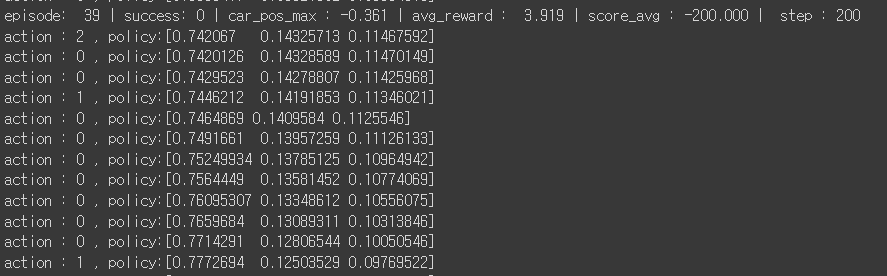 먼가 보상 설계가 잘못되거나 알고리즘 특징에 따라서 이렇게 나올 텐데, 생각해 보면 0번 action을 할 때 이 행동에 따른 reward가 계속 안좋게 나와야 보상이 약화 될 것이다. 하지만 Reinforce 특성상 에피소드에서 어떤 action을 취하는 지에 따라 매우 다양한 보상값이 나오게 되므로 상대적으로 우리가 원하는 보상을 받을 기회가 많지 않게 될 것이다.
