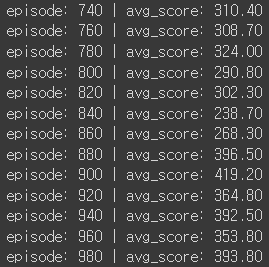 #### score --> 환경에서 reward는 매 step마다 -1 감소 인데, 200 step이 되면 종료되므로, -200 보다 커질수록 높은 score