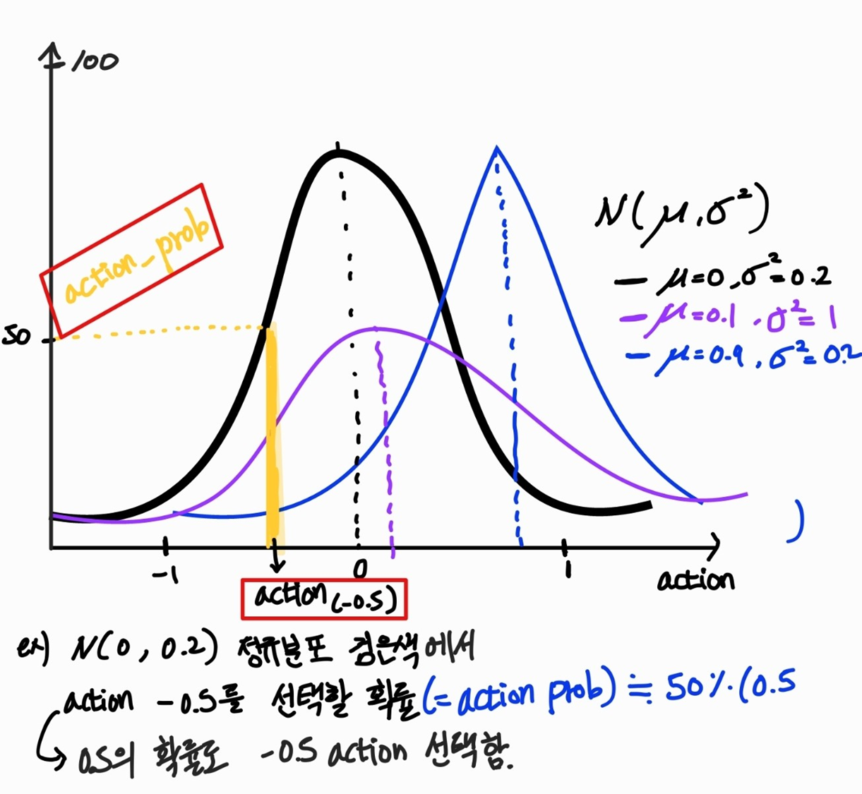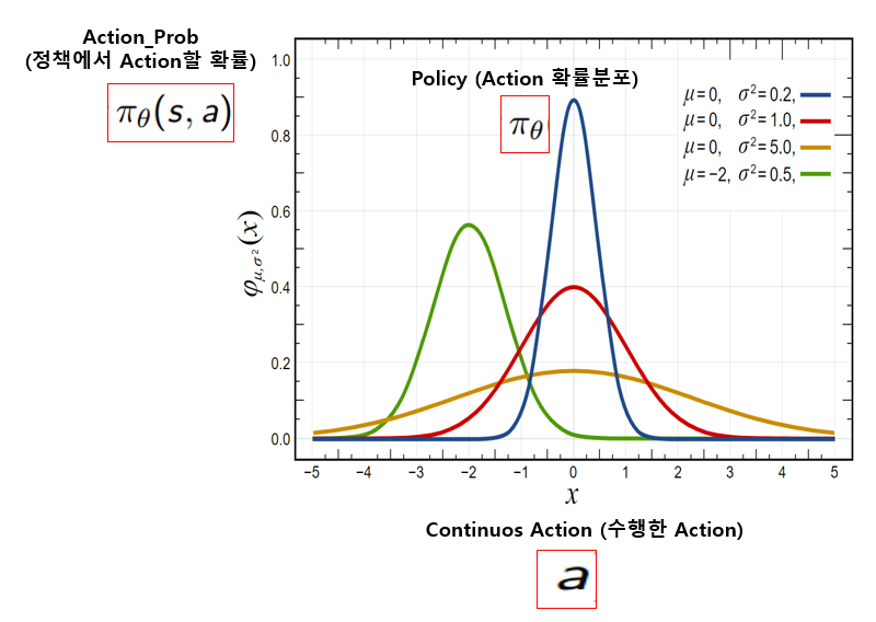 2)에서 실제 수행한 action의 확률을 구하기 위해 dist라고 만든 정규분포에서 action을 넣어 action prob를 구함.