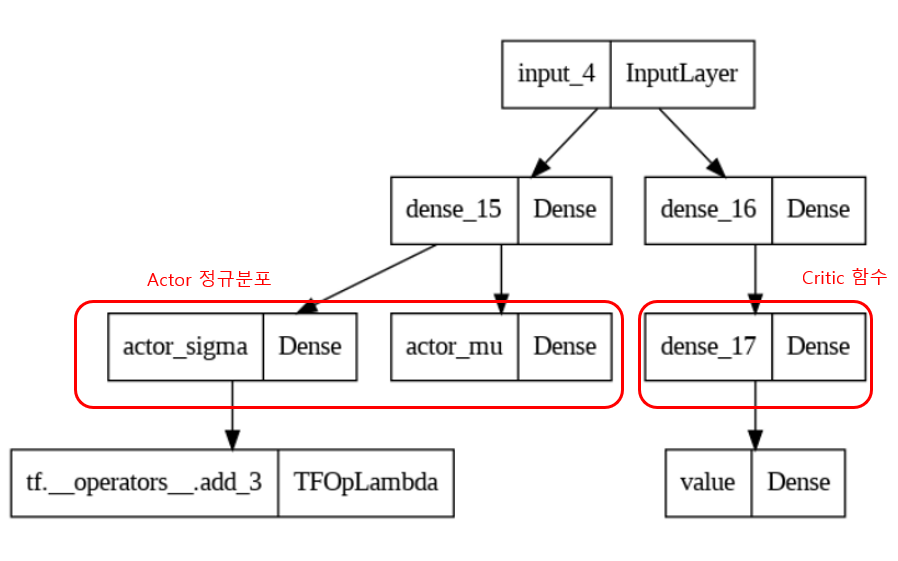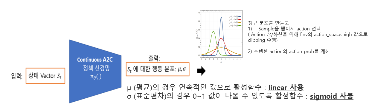 이번에는 실습할 내용은Continuos A2C로 A2C에서 Policy를 action이 Discreate (이산적) 인 것이 아니라 Continuos(연속적)인 정규분포를 형태로 만드는 것으로 기존과 큰 차이점은 Actor 신경망을 만들 때, 아래와 같이 정책신경망이 μ (평균),