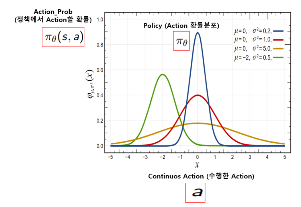 --> 이전 발행글에서 Discreate(이산적)과 Continuos (연속적)인 Action Space에 대하여 설명하였다. Continuos Action의 경우에는 μ (평균), σ (표준편차) 를 인공신경망으로 출력하여 이것을 토대로 정규분포 형태의 Policy를 만들어서 action 선택에 사용한다.
