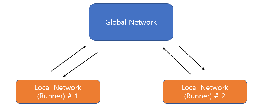 --> 앞에서 A3C의 실습도 진행하였는 데, A3C는 Asynchronous Advantage Actor-Critic의 약어로 아래의 그림에서 처럼 Global Network와 동일한 Local Network를 병렬적으로 생성하고, Local Network의 다양한 환경에서 얻은 데이터를 바탕으로 Global Network의 parameter를 업데이트하는 방향으로 진행한다. 여기서 Action 을 선택할 때 사용되는 신경망인 정책신경망을 Continuos A2C와 동일하게 사용하는 것만 변경하면 Continuos Action을 사용하는 Mountain Car환경에서 사용할 수 있다.