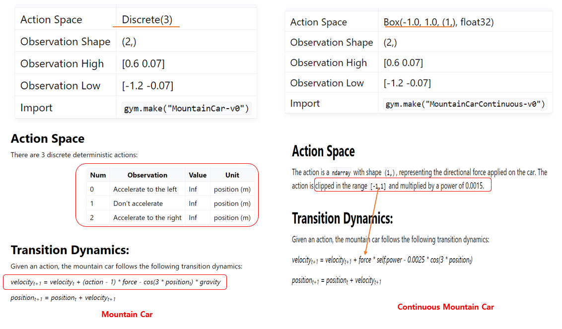왼쪽이 Mountain Car 환경이며 오른쪽이 Continuous 환경이다. 차이를 보면 우선 Action Space가 왼쪽은 이산적으로 3가지 action이 가능한 반면에 오른쪽은 Action값이 (1,) 형태로 [-1.1] 사이의 하나의 값이 되며, 이값은 force term으로 velocity 계산 수식에 적용된다.