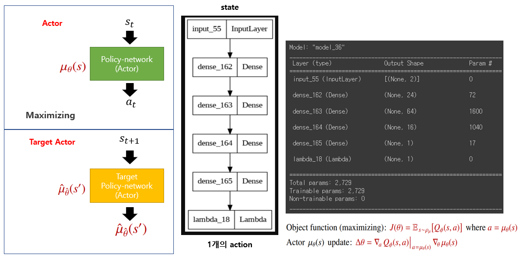 Actor Network는 state 정보를 받을 때 action에 해당하는 정보를 결정하는 부분으로 실제 수행하는 action을 결정하는 actor network와 Critic 함수 부분의 target 계산시에 들어갈 action을 결정하는 target actor network로 나뉘게 된다. Dense layer를 통해 구성되어 있으며 마지막은 action_size에 해당하는, 여기서는 Action Space가 (1,)로 1개의 action에 대한 값을 output으로 갖는다. 마지막 lambda 부분은 action의 bound를 정해주는 것으로 코드에서는 아래와 같이 적용되었다.