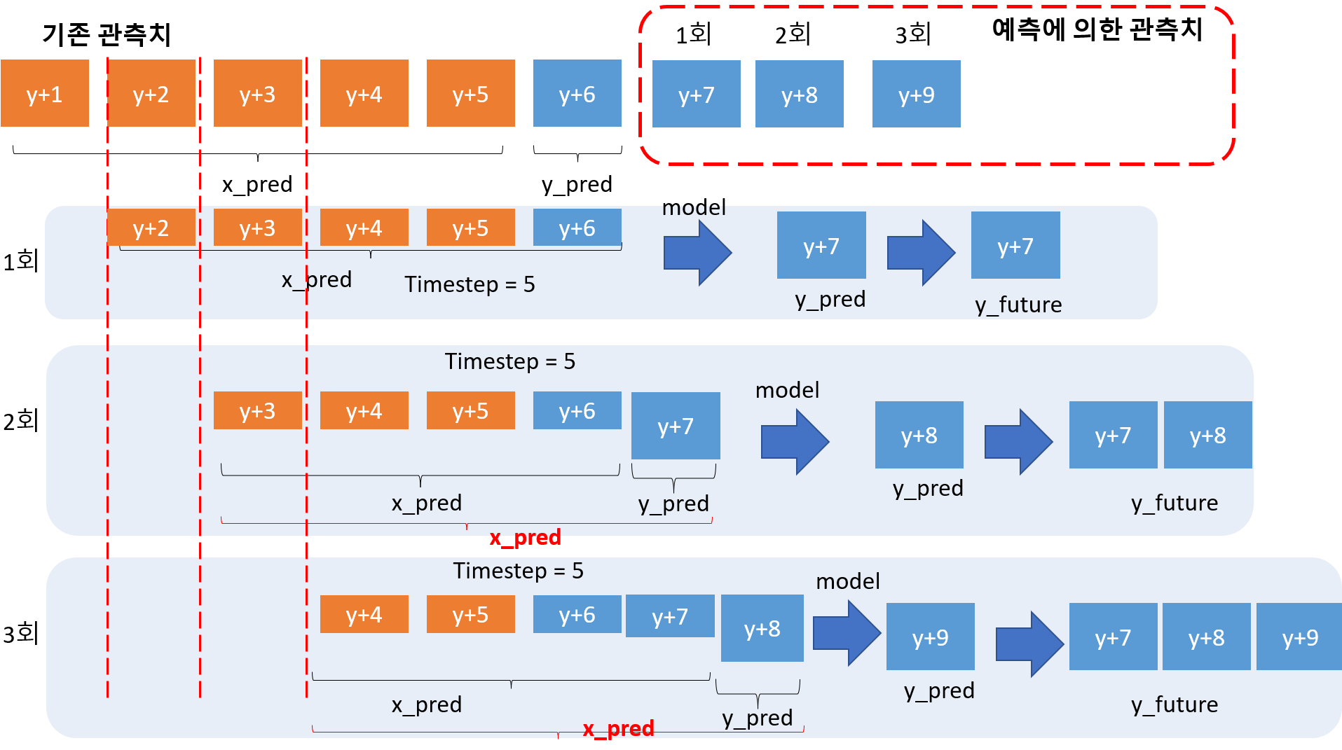 위의 그림에서 보면 조금 이해가 된다. 계속해서 y_pred값이 model로 부터 예측한 값으로 추가되어 x_pred가 되고 계속 계속 움직여 가며 forcast_period까지 예측이 된다.