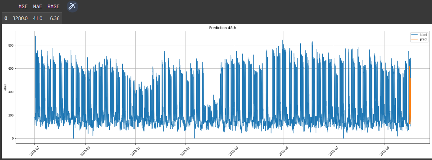 model예측을 수행하는 forcast는 y_labal이 한개씩 예측되므로 우리가 원하는 forecast_period 만큼 반복하여 수행된다.