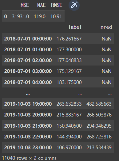 result_df['pred'] = prediction ## dummy (y_train 갯수) + n_future (갯수)