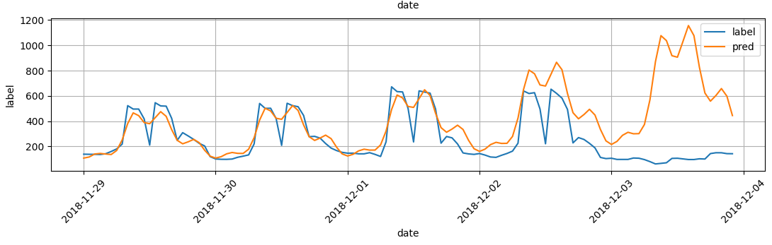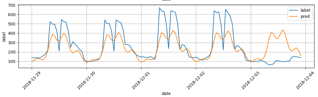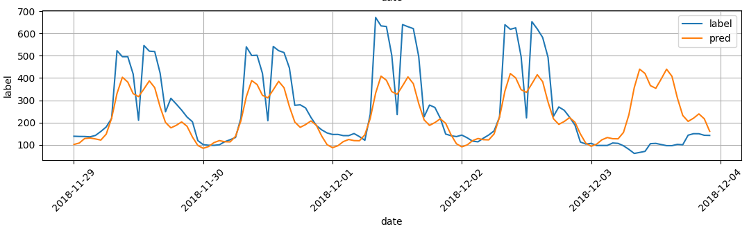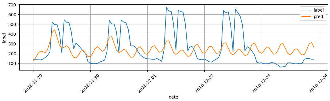 일 주기내에 있는 시간 주기를 만족시키는 것을 볼 수 있으며, 일별로 증가 추세를 맞출 수 있다. 그러나 아직 전체적인 크기는 맞출 수 없으며 12월 3일 처럼 일반적인 패턴을 따라 가지 않은 경우는 맞출 수 없는 것을 볼 수 있다. 이것이 위에 말한 고정된 주기성을 의미한다.
