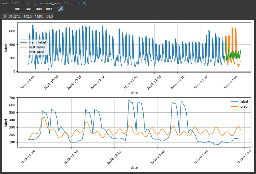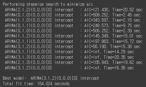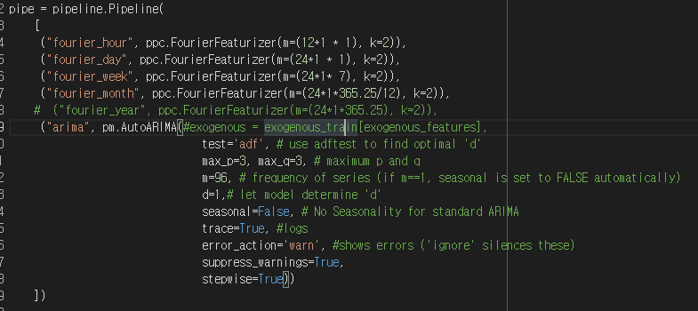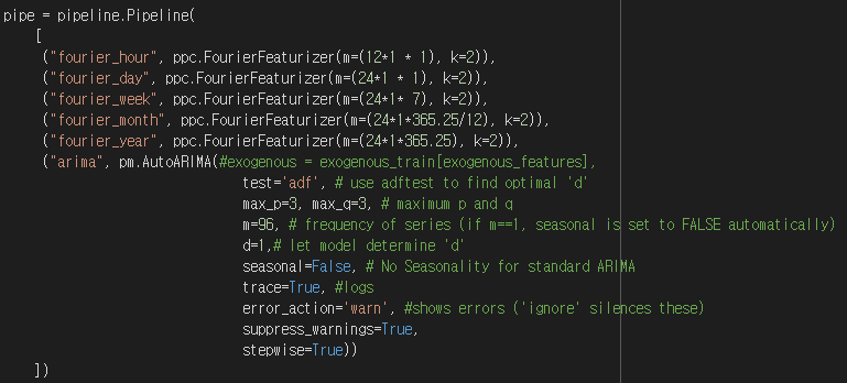 코드는 위와 같이 auto arima 또는 pipeline으로 구축하여 사용한다.