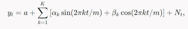 --> 일반적인 실생활 데이터는 계절성 성분을 한개만 갖고 있지 않고, 주 / 월 / 연도별 패턴을 가지고 있으므로 단순히 SARIMA 문제로는 해결이 불가능하다. 이 떄 해결가능한 방법은 위의 블로그에서 말함 Fourier 방법이며, 아래의 식으로 나타낼 수 있다.