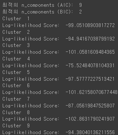위의 결과를 보면 AIC 측면에서 최적의 클러스터는 9개로 결정되었고, 각각의 Log-likehood Score는 다음과 같다. Log-likehood는 모델의 파라미터를 구하는데 사용되는 최대 우도(Maximum Likelihood)를 로그 변환한 것으로