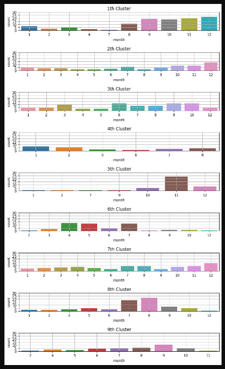 클러스터별 월별 분포를 보면 어떤 클러스터는 월별 분포가 두드러진 것도 있고 어떤 것은 월마다 큰 편차가 없어 구분하기 어려운 것도 있다.