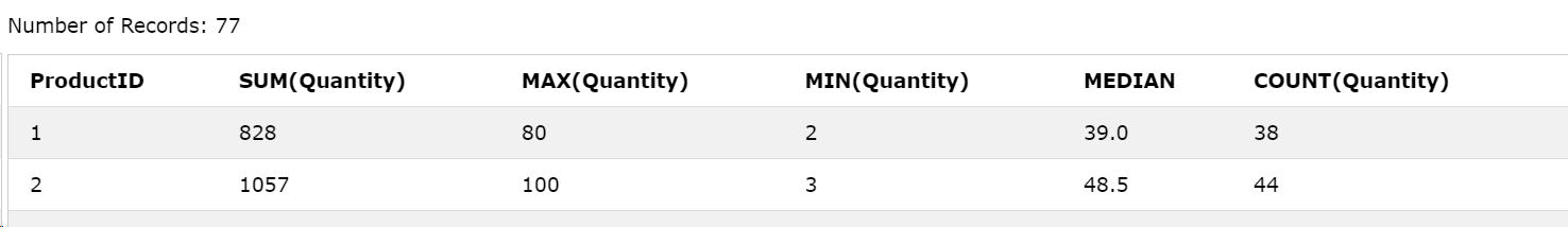 -> 각 PRODUCT ID 마다 Quantity의 SUM / MAX / MIN / MEDIAN / COUNT를 계산함