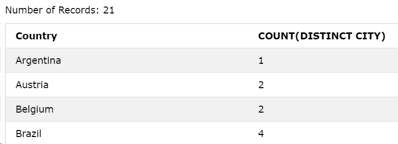 , COUNT(CONCAT_WS(" - ",Country,City))