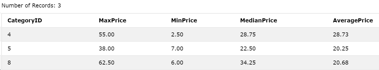 -> CategoryID가 2 보다 큰 항목들을 그륩하여 MAX/ MIN / MEDIAN / AVG 가격을 구하고